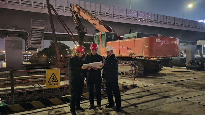 在南河大橋拓寬改造(二期)工程施工現(xiàn)場,工程管理公司工作人員組織參建人員有序推進(jìn)水中墩鋼護(hù)筒下放定位、鋼平臺(tái)拆除、交叉口道路改造等施工作業(yè)。