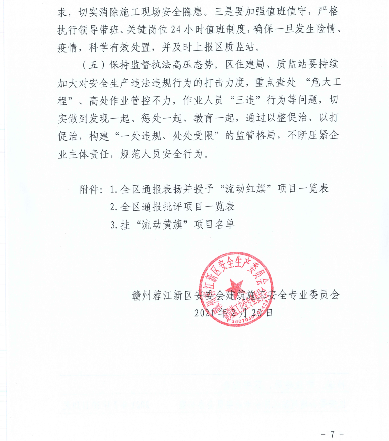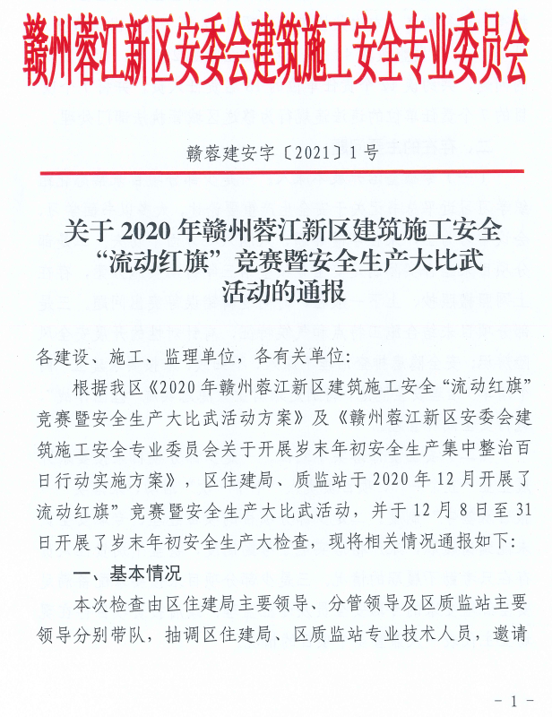 3月2日上午,贛州蓉江新區(qū)表彰通報2021年贛州蓉江新區(qū)建筑施工安全“流動紅旗”競賽暨安全生產(chǎn)大比武活動開展情況,其中,星洲萃苑(一期)項目在此次評比中喜獲“流動紅旗”,并獲得贛州蓉江新區(qū)安委會發(fā)放的經(jīng)濟(jì)獎勵12000元整。