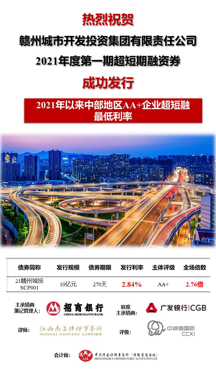 近日,贛州城投集團(tuán)2021年度第一期超短期融資券(SCP001)在銀行間債券市場成功發(fā)行,金額10億元、票面利率2.84%、發(fā)行期限270天,全場認(rèn)購倍數(shù)2.76倍,創(chuàng)2021年以來中部地區(qū)AA+企業(yè)超短融最低利率。