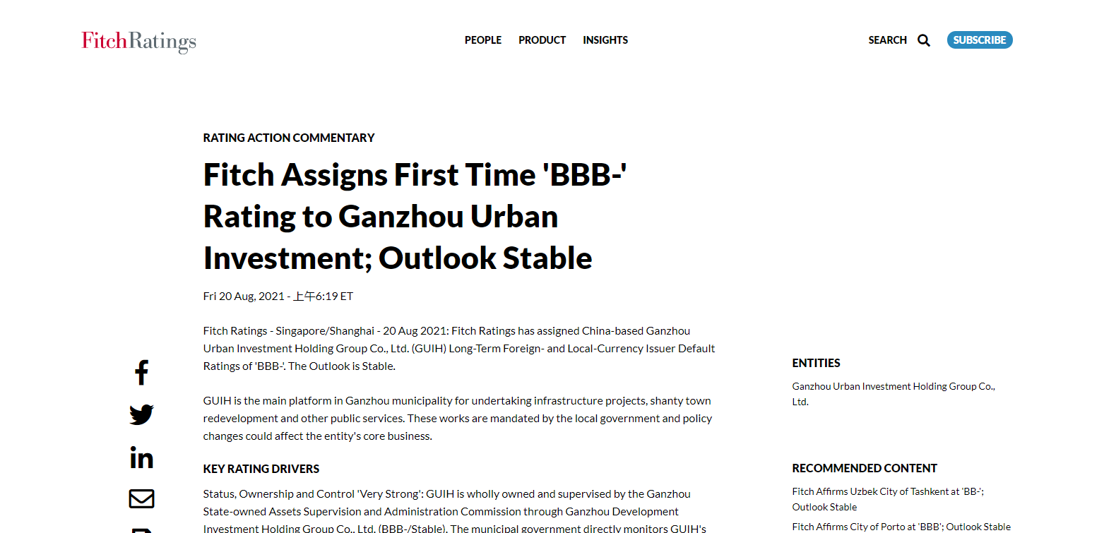 日前,經(jīng)國際權(quán)威信用評級機構(gòu)之一——惠譽國際信用評級公司評定:贛州城投集團(tuán)首次國際信用評級為BBB-,信用評級展望