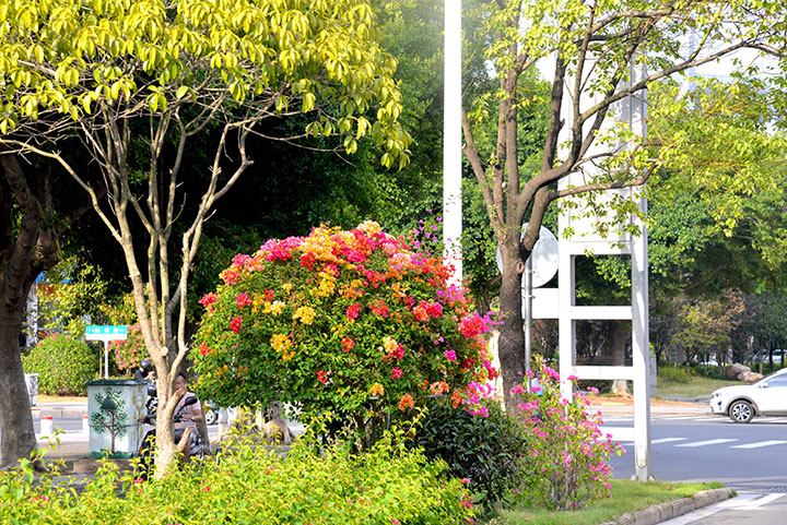 為迎接國慶,贛州生態(tài)環(huán)境有限公司在市園林環(huán)衛(wèi)管理中心技術人員的指導下利用多種新工藝、新手法、新技術進行控花,以保證三角梅在國慶期間同時綻放,爭鮮斗艷。同時,今年在興國路還種植了五彩三角梅,不同顏色的花朵在一棵三角梅植株上同時開放,吸引了市民們的注意,引來許多市民“打卡”觀賞。