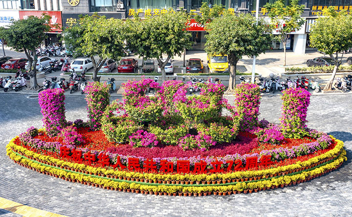 贛州城投集團的工作人員介紹,“含蕊紅三葉,臨風艷一城”三角梅以絕色天姿代表著贛南人民熱情、朝氣、堅韌不拔和頑強奮進的精神,滿城齊放展現(xiàn)對祖國的美好祝愿。