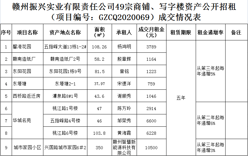 2020年10月27日上午10時,在贛州市公共資源交易中心舉行的贛州振興實業(yè)有限責任公司49宗商鋪、寫字樓資產(chǎn)公開招租(項目編號:GZCQ2020069),現(xiàn)將公開招租成交情況公示如下: