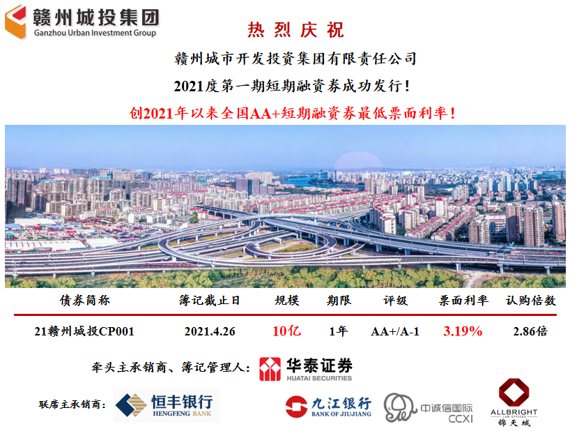 4月26日,贛州城投集團(tuán)2021年度第一期短期融資券成功發(fā)行,金額10億元,發(fā)行利率3.19%。該債券是2021年以來全國同主體評級(jí)AA+短期融資券最低利率,也是集團(tuán)戰(zhàn)略發(fā)展部黨支部黨員學(xué)黨史、悟思想、辦實(shí)事、開新局的又一工作成效。